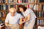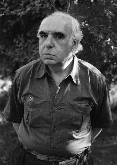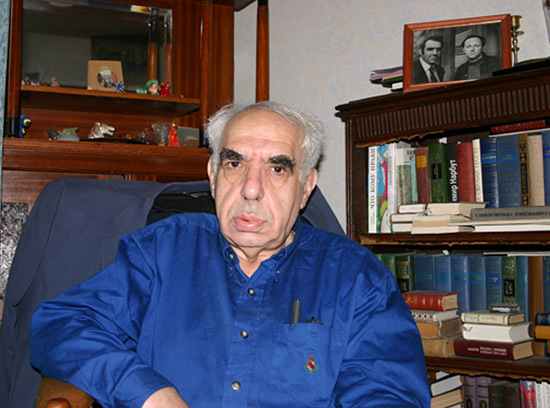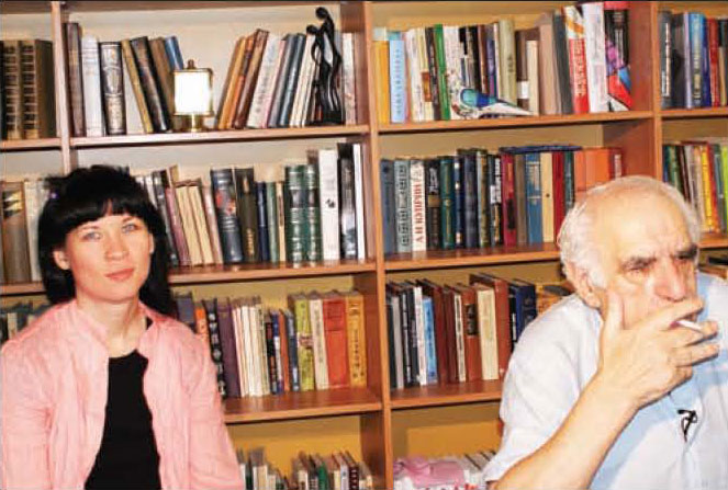 Евгений Рейн на фоне библиотеки Евгения Степанова